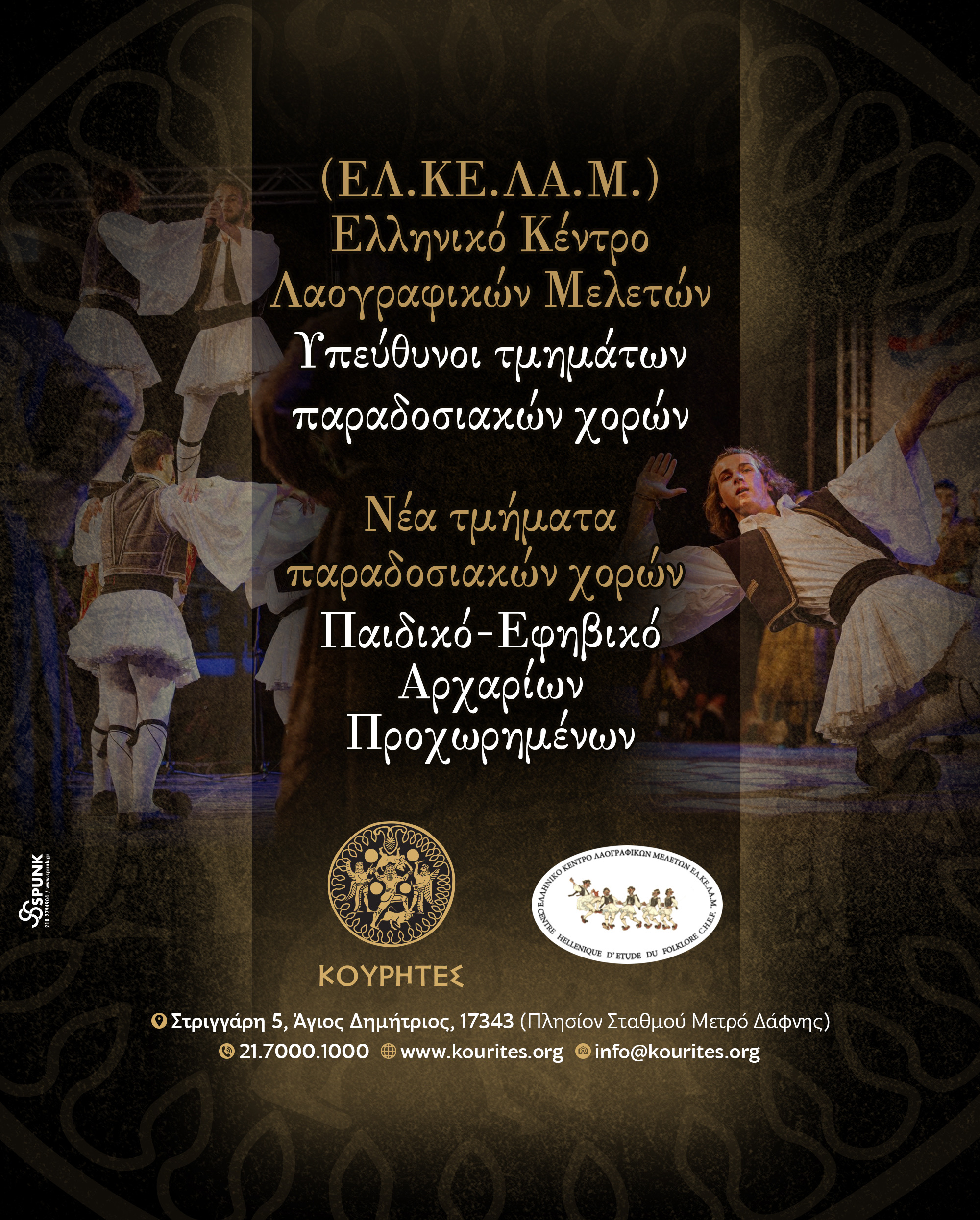 Με ιδιαίτερη χαρά και ενθουσιασμό σας ανακοινώνουμε τη νέα μας συνεργασία με το Ελληνικό Κέντρο Λαογραφικών Μελετών (ΕΛ.ΚΕ.ΛΑ.Μ), έναν οργανισμό με μακρά και αξιόλογη πορεία στον χώρο του παραδοσιακού χορού και της λαογραφίας. Από την επόμενη χορευτική χρονιά 2024-2025, όλα τα τμήματα των παραδοσιακών χορών στους ΚΟΥΡΗΤΕΣ θα πραγματοποιούνται υπό την καθοδήγηση του έμπειρου χοροδιδασκάλου και ιδρυτή του ΕΛ.ΚΕ.ΛΑ.Μ, κ. Βασίλη Δημητρόπουλου.